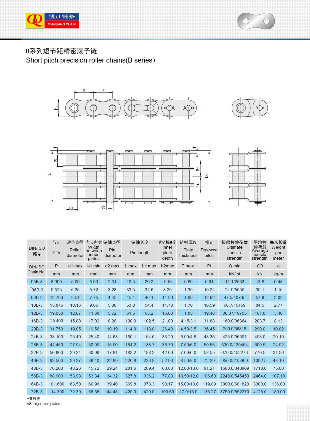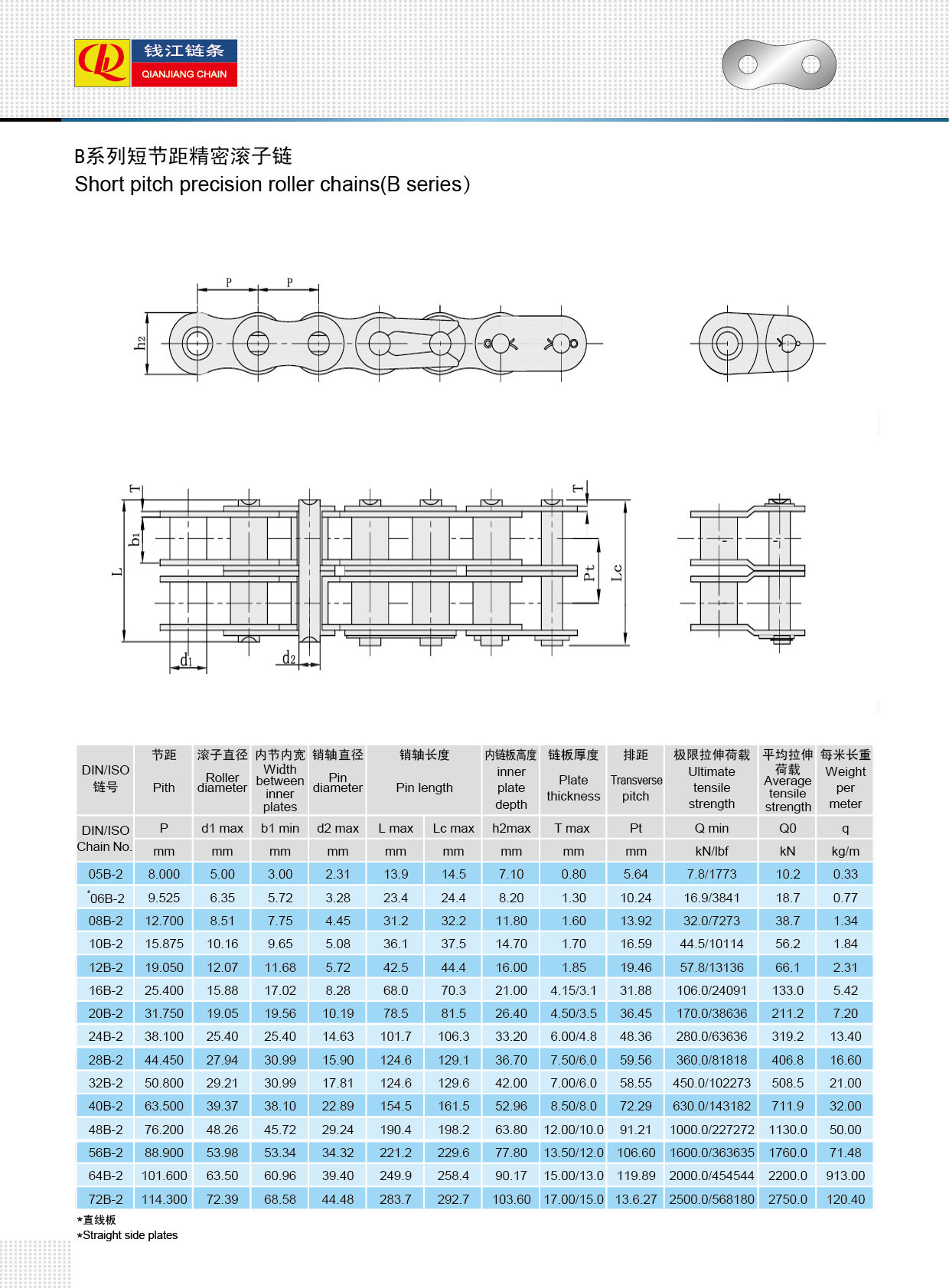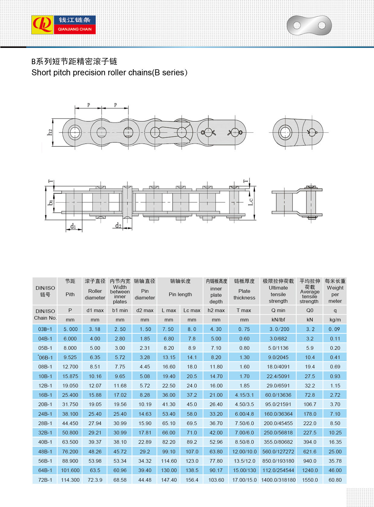 Déantar Slabhraí Rollóra Beachtais Gearr-Pháirc (Sraith B) a innealtóireacht chun feidhmíocht agus iontaofacht eisceachtúil a sheachadadh, rud a fhágann go bhfuil siad ina chloch choirnéil d'iarratais tionsclaíocha nua-aimseartha. Tá na slabhraí seo déanta as cruach ard-neart de ghrád préimhe, agus tá neart teanntachta ag na slabhraí seo, rud a chinntíonn gur féidir leo na coinníollacha oibriúcháin éilitheacha a sheasamh. Ní hamháin go gcinntíonn a dtógáil láidir fad saoil ach laghdaítear caitheamh agus cuimilt chomh maith, fiú i dtimpeallachtaí ardluais agus ardluais.