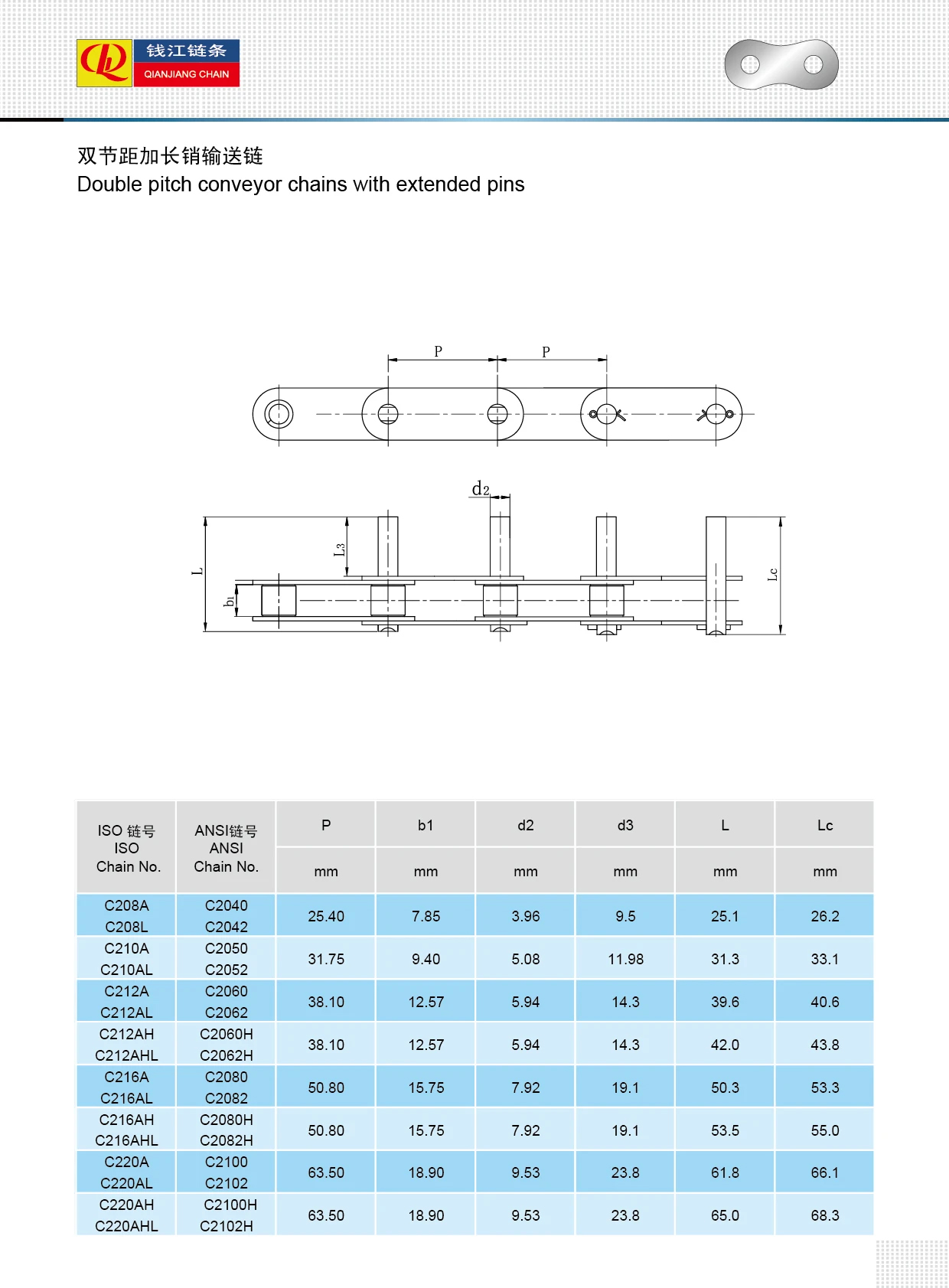 Slabhraí iompair dúbailte pitch le bioráin leathnaithe