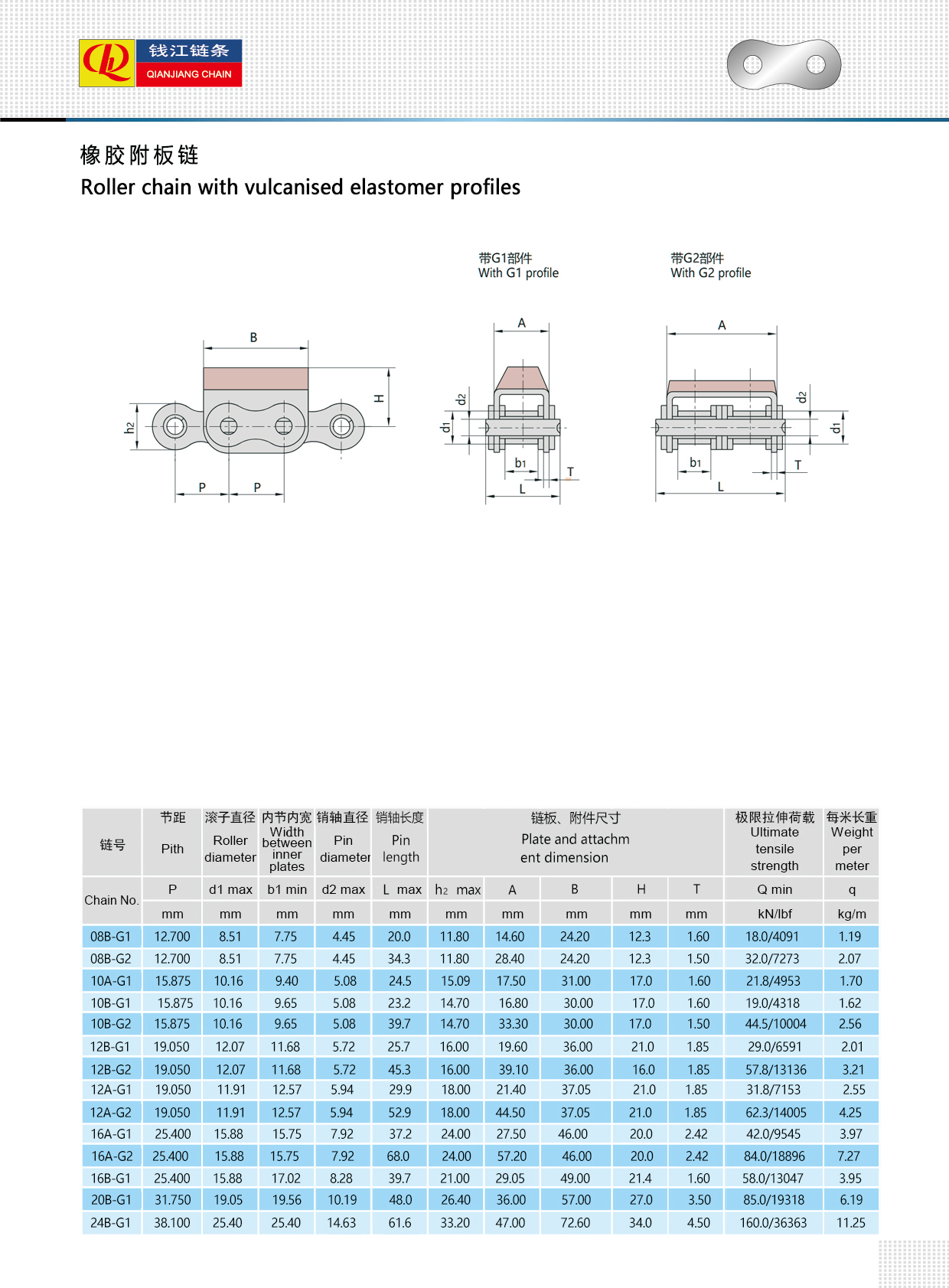 I dtáirgeadh uathoibrithe tionsclaíoch nua-aimseartha, cuireann cobhsaíocht agus éifeachtúlacht an chórais iompair ábhair isteach go díreach ar an gcumas táirgthe iomlán agus ar an gcáilíocht. Mar réiteach ardfheidhmíochta comhtháite tarchuir agus iompair, úsáidtear an slabhra Roller le próifílí elastomer bolcánaithe go forleathan i bpróiseáil bia, sórtáil lóistíochta, innealra talmhaíochta, trealamh pacáistithe agus réimsí eile, agus seasann sé amach as a fhriotaíocht chaitheamh, ionsú turraing agus airíonna frith-duillín. Tá an slabhra sorcóir le próifílí elastomer bolcánaithe bunaithe ar an slabhra sorcóir caighdeánach, agus úsáideann sé próiseas vulcanization chun cinn chun elastomer rubair nó teirmeaplaisteacha ardchaighdeáin a nascadh go daingean le pláta slabhra seachtrach nó pláta imthacaí an slabhra. Ní hamháin go gcoimeádann an struchtúr ilchodach seo ard-neart agus marthanacht an slabhra miotail, ach tugann sé na buntáistí uathúla seo a leanas dó freisin:
